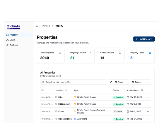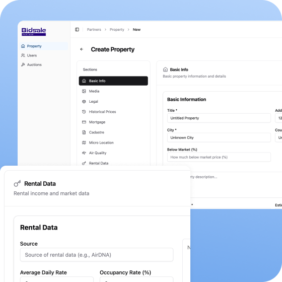 Bidsale Partner is a professional platform built for organizations operating in European property auctions. It enables real estate agencies, investment funds, legal firms, family offices, and NPL specialists to manage auctions, integrate proprietary and legal data, and serve clients at scale. With flexible workflows, API and SaaS access, and support for both B2B and B2B2C models, Bidsale Partner can help you operate efficiently, expand across markets, and unlock new revenue opportunities—while staying fully in control of your data and operations.