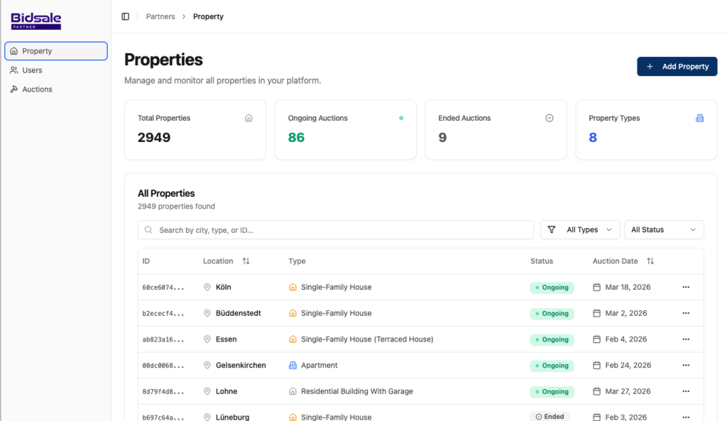 The Bidsale Partner Platform is designed for organizations that operate inside distressed real-estate markets and need more than just listings.
