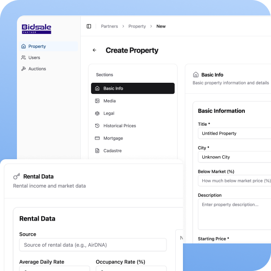 Bidsale enables partners to ingest, manage, and enhance property and auction data within a shared workspace. Combine your expertise with platform intelligence to create structured, client-ready portfolioswithout relying on disconnected tools or manual processes.